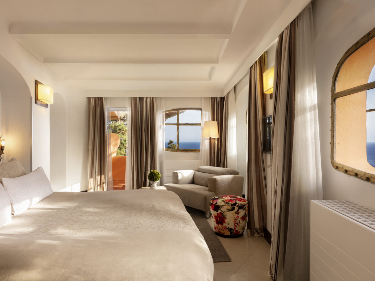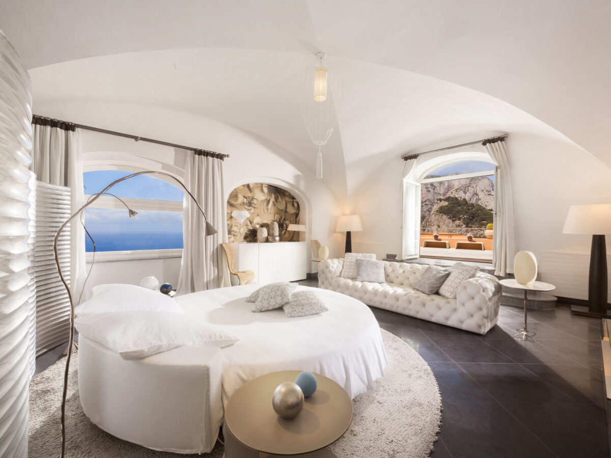 Le 43 camere e suites sono sparse su tre livelli e sono tutte diverse l’una dall’altra, con arredamento contemporaneo o classico, con bagni in marmo imperiale, pezzi d’antiquariato o opere d’arte moderna, ma tutte sono dotate di balconi, terrazze o patii che si affacciano sulla rigogliosa natura caprese.