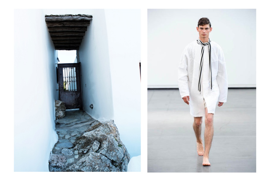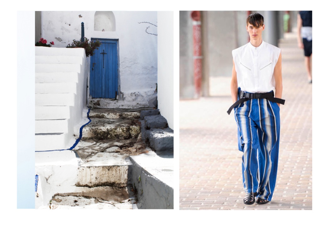 Sempre piu forte e presente anche sulle passerelle di oggi, il contrasto, sembra farla da padrona. Giochi di colori, mix tra nuance pure come il bianco e tinte forti come l’arancio e il blu. I designer per l’estate hanno osato accostamenti essenziali, ma dai toni quasi fluo. Philip Lim gioca con contrasti di stili e materiali: capospalla dal tessuto e forma contemporaneo abbinato a un total look piu sobrio e tradizionale e a pantaloni morbidi dall’aspetto trasandato. Il tutto mixato a una camicia dal taglio classico. Anche il designer Tillmann Lauterbach rivisita la famosa tunica greca riproponendola in chiave moderna accoppiata a un attualissimo bomber. L’importante è che sia bianco, magari “macchiato” di colore qua e là. Rinnovarsi si, ma senza stravolgere completamente le regole della moda maschile. Questo lo stile dell’estate, anche al sole dell’incantata Skyros.