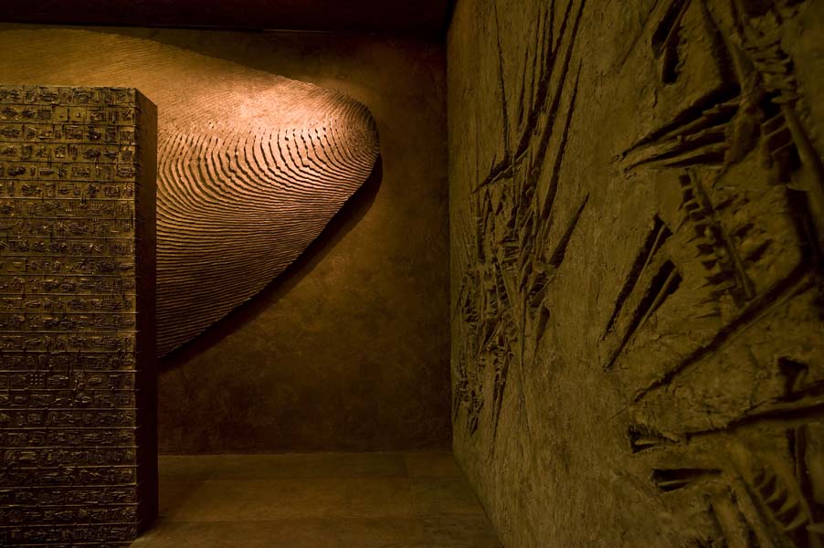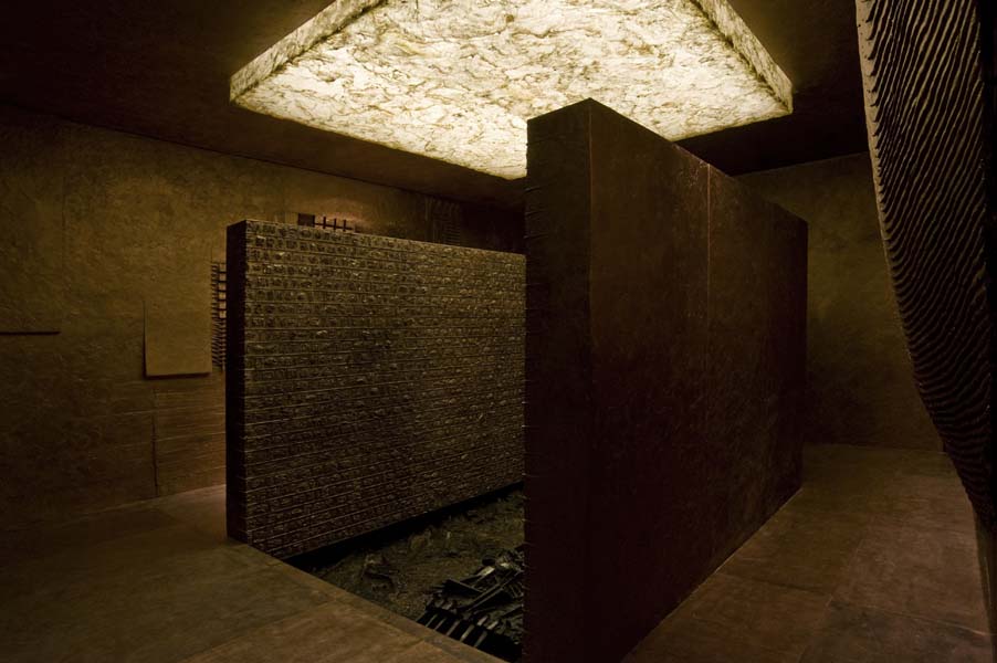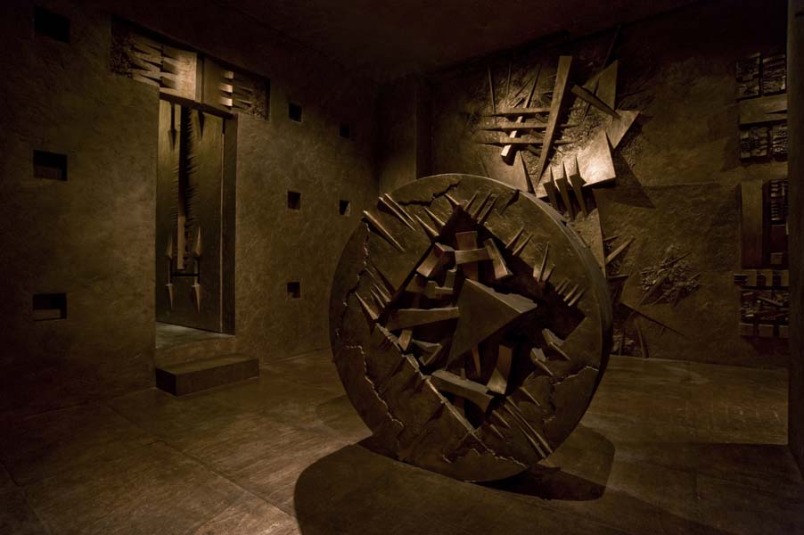Siamo tutti dentro (e non di fronte, badate bene) quella scultura ambientale, realizzata dall’artista nell’arco di sedici anni, dal 1995 al 2011. Dispersi nei suoi magmatici meandri, tra scompartimenti di metamorfiche dimensioni, dall’onirico all’inconscio, costellate di ricordi, rimozioni, illusioni, speranze lattiginose e lucide gioie. Disorientati. In cerca di appigli sicuri per navigare a vista il presente, rintracciando un conforto passato, mirando un futuro fragile. Decifrando i linguaggi arcaici e ancestrali che sfilano incisi tra le pareti rotanti e le trame di microchip elettronici ormai sepolte, obsolete, nel dedalo dell’artista, il nostro. Immersi in una condizione straniante e silenziosa, che senza tregua ci sfianca dilatando nel dubbio la coscienza, rimescolandone (per fortuna) le priorità.