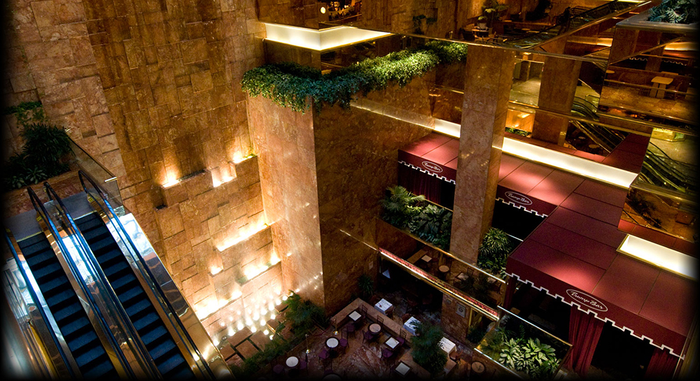 Dal punto di vista architettonico il potere del magnate si riconosce dalla Trump Tower a New York, sulla 5th Avenue, che ospita anche il suo principale mega-appartamento e il quartier generale della Trump Organisation. Il grattacielo include negozi, caffè e ristoranti, uffici, oltre che residenze private e un vasto atrio con una cascata. E’ stato la sede dello show della NBC The Apprentice. Successivamente, Trump ha costruito il grattacielo Trump World Tower davanti alle Nazioni Unite e la Trump Place un complesso di appartamenti di fronte al fiume Hudson River.
