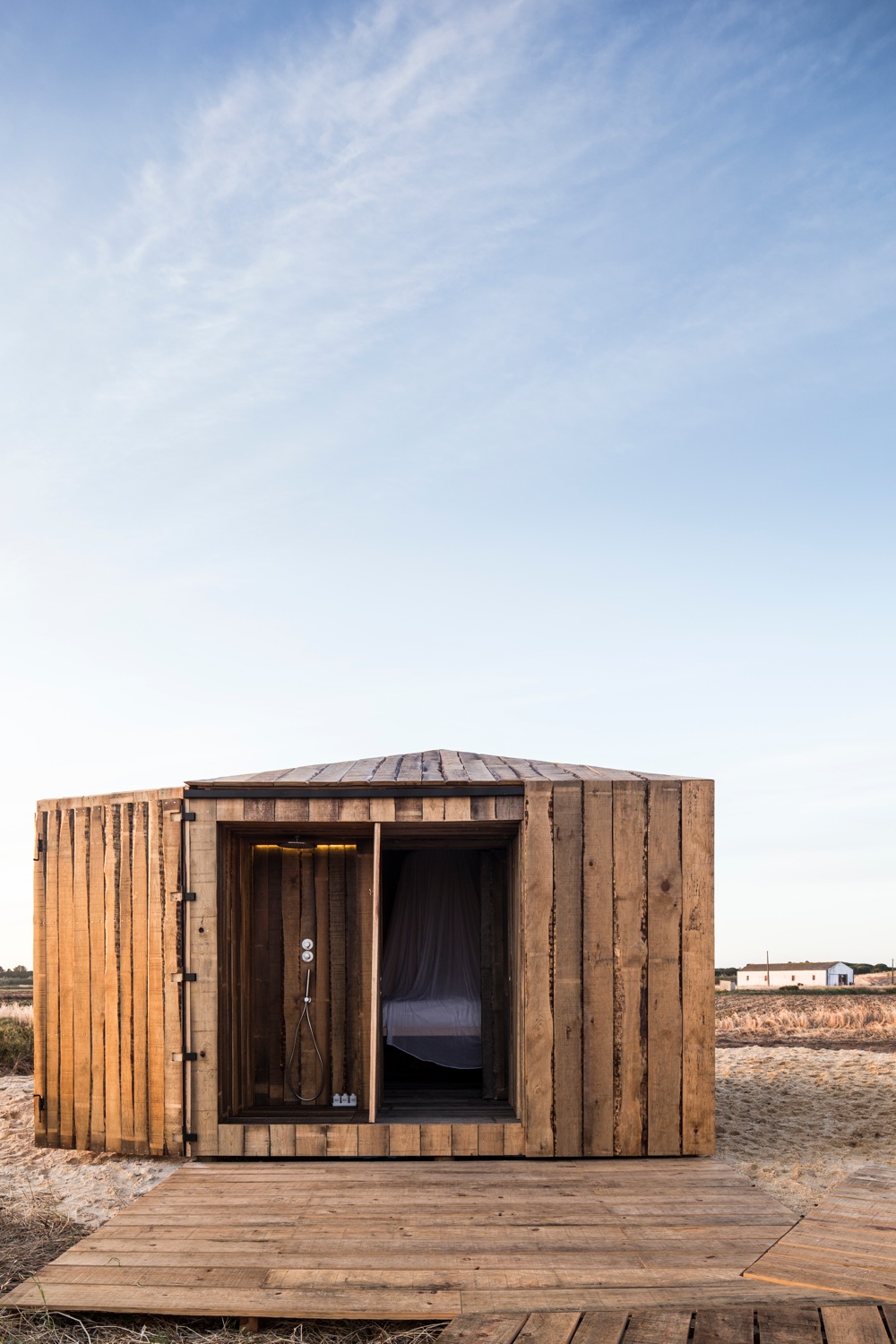 A pochi chilometri da Lisbona, le Cabanas sono state pensate dall’architetto portoghese Manuel Aires Mateus come due stanze separate ma complementari i cui pannelli esterni e interni che compongono pareti, pavimenti e tetto sono di legno riciclato (Aires Mateus)