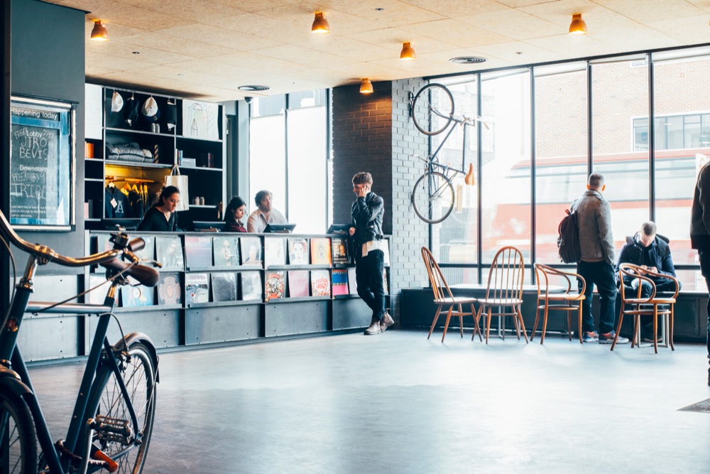 La hall dell'Ace Hotel di Shoreditch High Street, a Londra, dove abbiamo trascorso 4 giorni per raccogliere dai clienti racconti di vita e indirizzi insoliti (Mattia Balsamini)