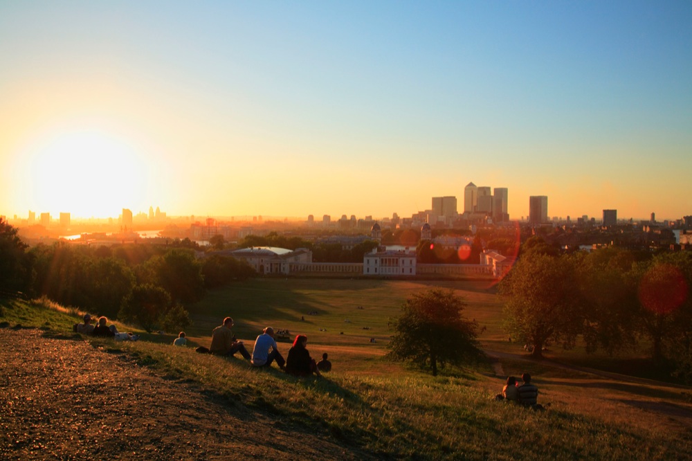 People enjoying late afternoon sunlight in Greenwhich Park with a view across the London skyline