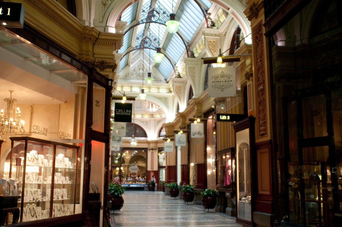 Dalla centralissima Collins Street si entra nella Block Court, connessa con la Block Arcade. La galleria, famosa per i soffitti a vetro e i pavimenti a mosaico, fu costruita nel 1891 ed è nota come lo "struscio" più in di Melbourne dove fare shopping e mettersi in mostra (Bjanka-Kadic-Alamy)