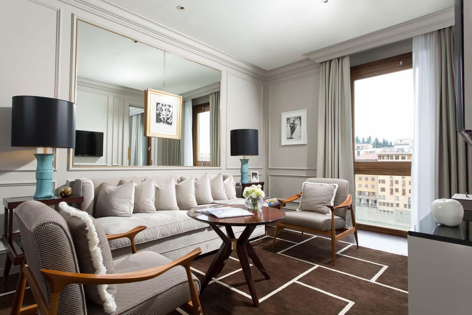 Con vista spettacolare su Ponte Vecchio e sull’Arno, accanto alle seducenti boutique di via de’ Tornabuoni, si trova Portrait Firenze, residenza di proprietà della famiglia Ferragamo che ha fatto dell’eleganza e dell’ospitalità “tailor-made” la sua arte. Punta di diamante dell’ospitalità fiorentina, dallo stile raffinato e dal carattere deciso e aristocratico, l’hotel sfoggia 37 suite disposte su sei livelli, e superbamente arredate con un tocco glamour e avvolgente dall’architetto fiorentino Michele Bonan. L’ambiente offre la tranquillità di un’elegante dimora dal fascino discreto e reinterpreta in chiave moderna lo stile vintage della tradizione fiorentina, attraverso un percorso iconografico fatto d’immagini tratte dall’archivio fotografico Lucchi che ritraggono importanti personaggi dello star system e della nobiltà a Firenze negli anni ‘50 diventati un’icona di eleganza contemporanea. Al piano terra della residenza, al numero 2P di Lungarno degli Acciaiuoli, il bistrot Caffè dell’Or delizia il palato dei suoi ospiti con una cucina di alto livello, in un’atmosfera chic e rilassata.