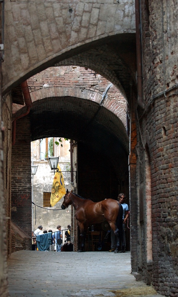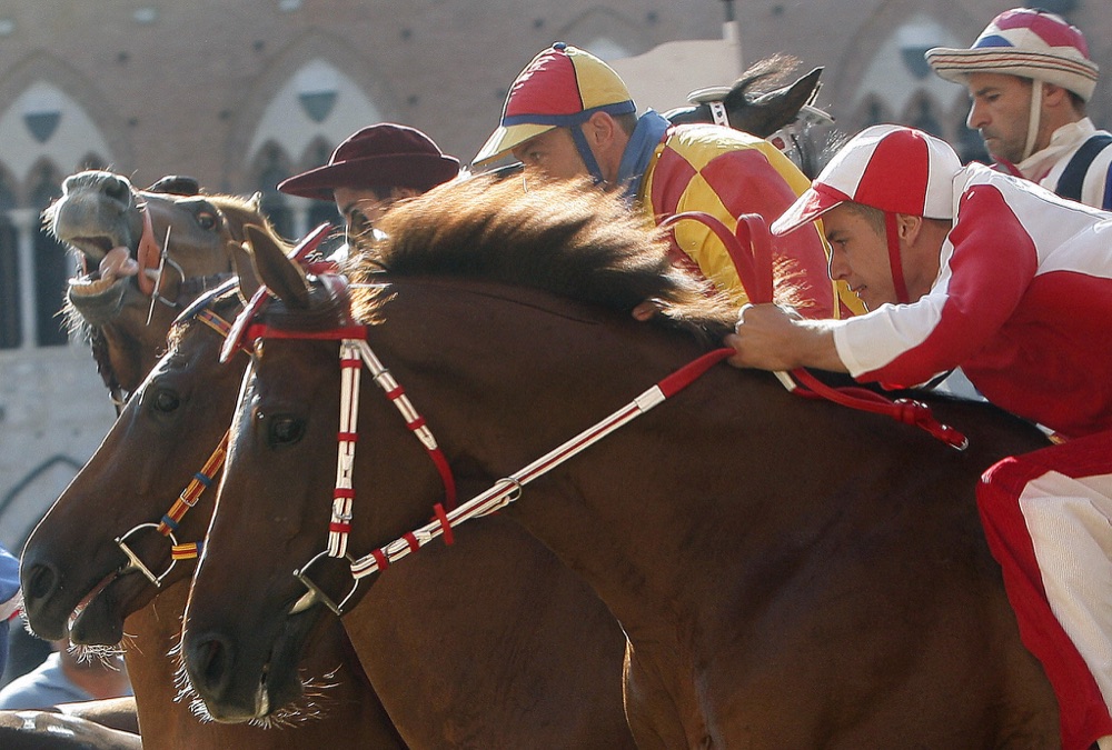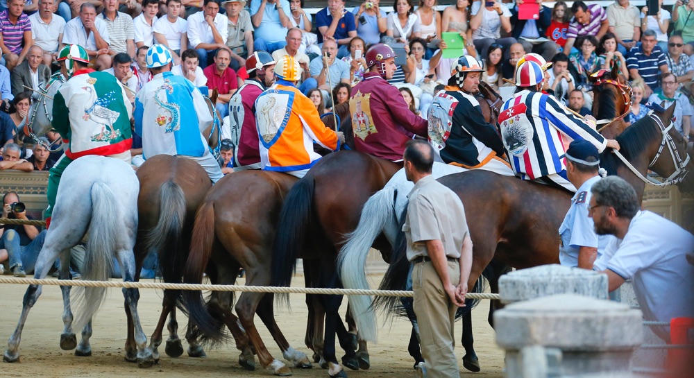 I cavalli si avvicinano alla mossa e si schierano sulla linea di partenza. Fremono nervosi, sbuffano impazienti, si toccano e spingono nell’attesa del via al Palio. Prima, un momento di totale silenzio quasi irreale. Poi, una bufera di polvere, grida d’incitamento, rumore di zoccoli. E tutto ha inizio.
