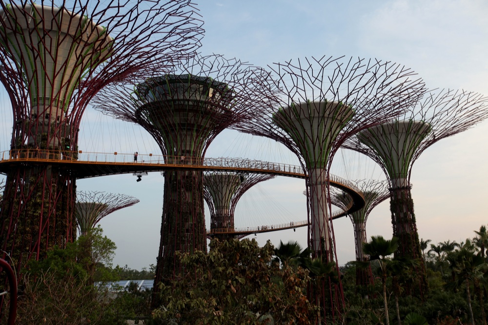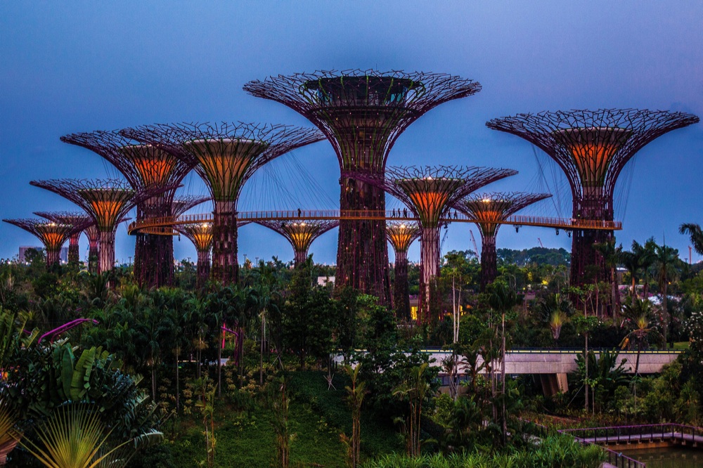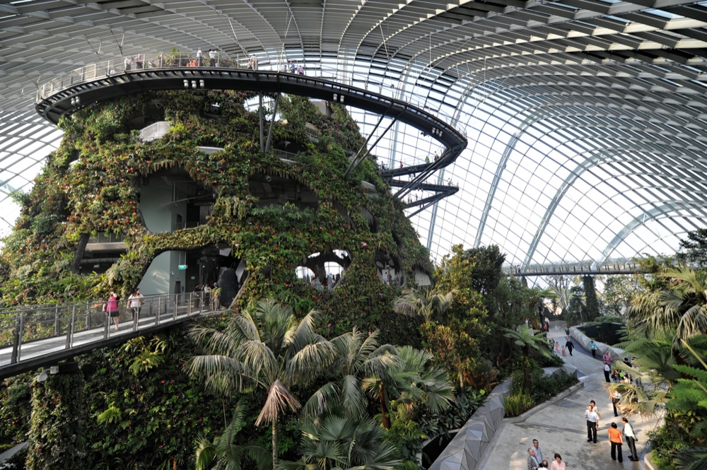 Passeggiare lungo i Gardens of the Bay, i giardini botanici progettati dallo studio Wilkinson Eyree, inaugurati nell’estate 2012 e spalmati su 101 ettari. Rappresentano uno dei più spettacolari esempi di sostenibilità applicata all’architettura, all’ingegneria e alla botanica.. Grazie alle più grandi serre a controllo climatico del mondo, ai super-alberi artificiali in grado di produrre energia rinnovabile, ai serbatoi per la raccolta dell’acqua piovana reimmessa nel sistema d’irrigazione interno, questo ecosistema urbano ad altissima densità di tecnologie per il risparmio energetico ha vinto il premio World Building of the Year 2012.