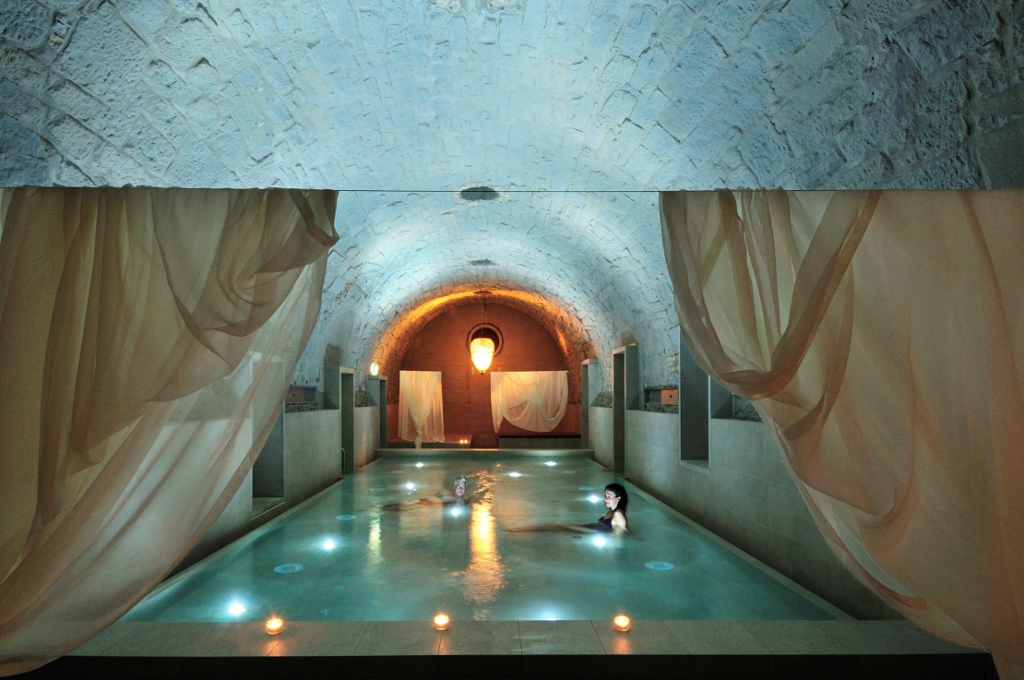 Nel Thermalbad si può nuotare nelle vasche ricoperte dalle volte in pietra delle cantine secolari, e poi risalire fino alla piscina riscaldata a cielo aperto sul tetto del birrificio, da cui si gode un panorama mozzafiato.