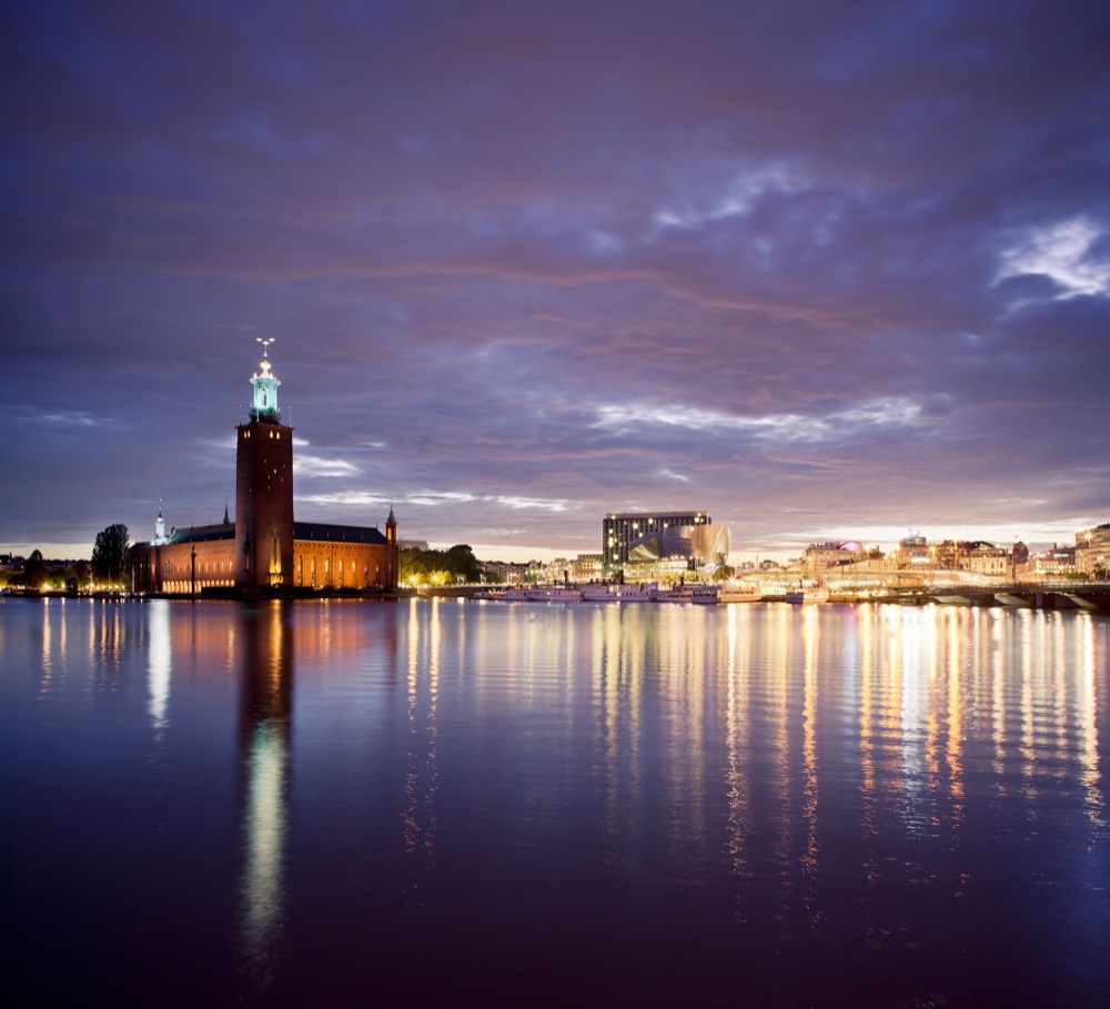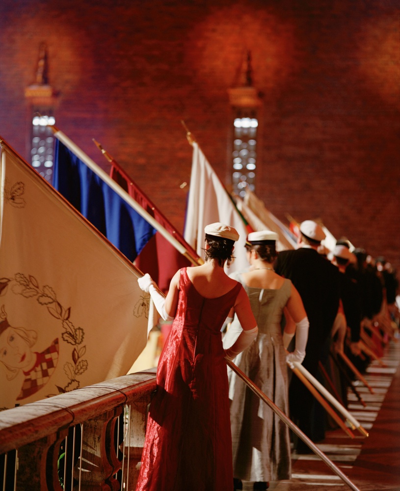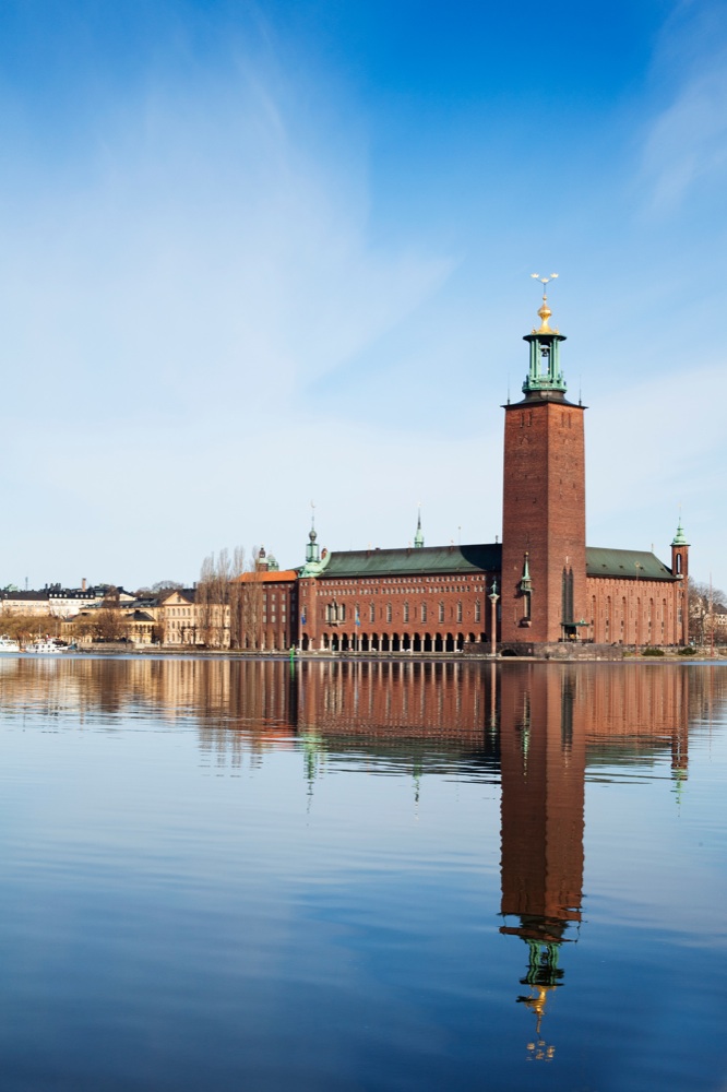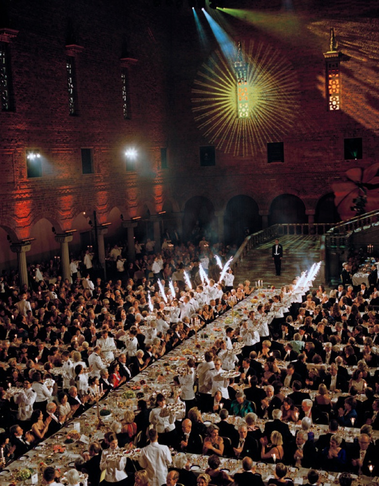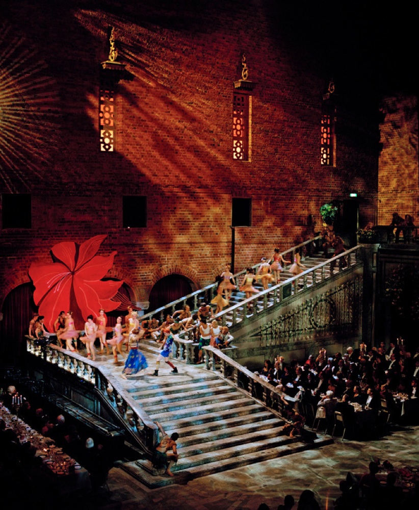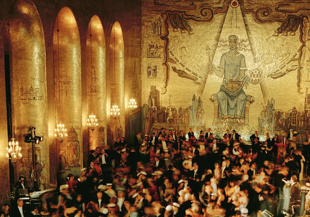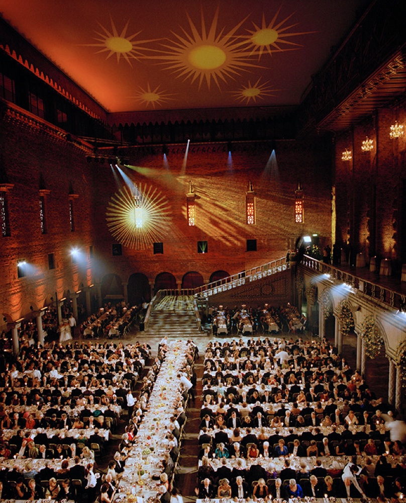 Stadshuset, ovvero il Municipio, in Ragnar Östbergs Plan. Qui si trasferiscono tutti gli invitati dopo la premiazione, per gustare il maestoso banchetto. L’edificio in stile nazional-romantico svedese fu costruito nel periodo 1911-1924 su disegni di Ragnar Östberg ed è un omaggio all’arte italiana. L’architetto infatti traeva ispirazione anche dai suoi viaggi nel nostro Paese: la grande Sala Blu, dove si tiene il banchetto per i 1.300 ospiti, con le colonne attorno all’atrio, ricorda una grande piazza italiana, mentre la Sala Dorata, dove si conclude la serata ballando fino a tardi, ha pareti coperte da mosaici fatti di 19 milioni di tessere d’oro realizzate a Venezia. Il Municipio è aperto al pubblico con visite guidate.