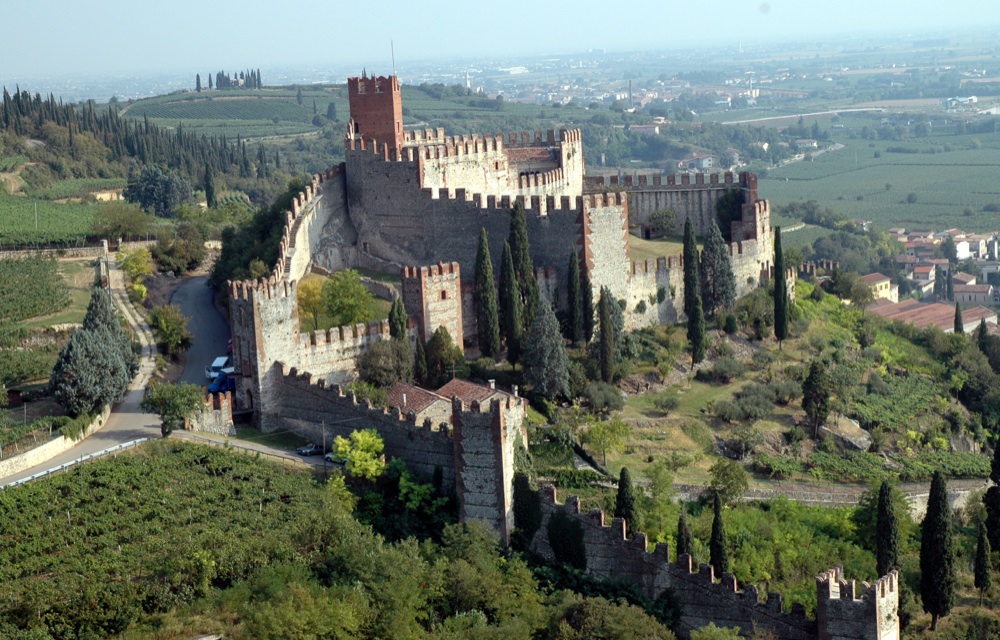 Castello di Soave risale al X secolo. Venne rifatto da Scaligeri e Veneziani. Attorno all’alta torre centrale si sviluppano gradualmente i giri delle mura che separano tre cortili e un piccolo cortile pensile.