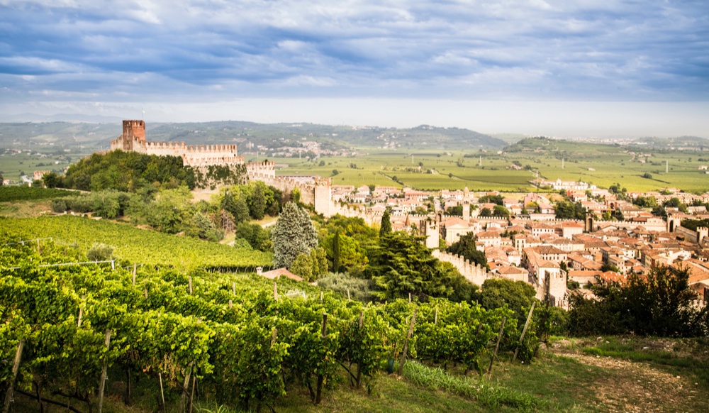 Vista di Soave (VR) con il famoso castello medievale e i vigneti in primo piano. Questo borgo medievale è città del vino: sulle sue colline viene coltivate le uve con le quali si produce il famoso vino Soave.