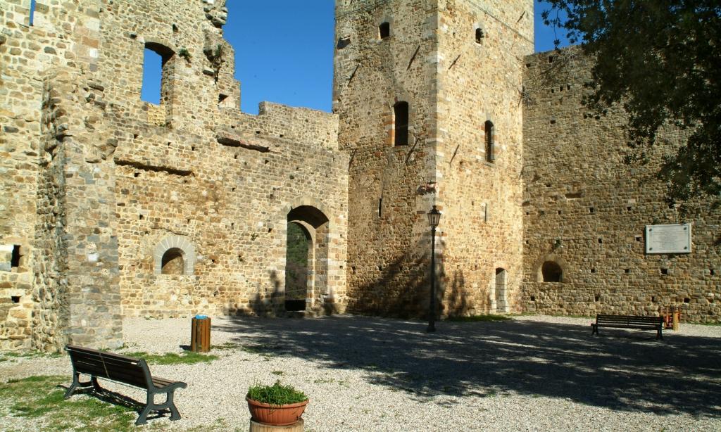 Piazza Querciola di Castelnuovo Magra (SP) con il Castello dei Vescovi Conti di Luni. Qui l’8 ottobre avrà luogo Sapori d’Autunno con stand gastronomici di prodotti locali di stagione