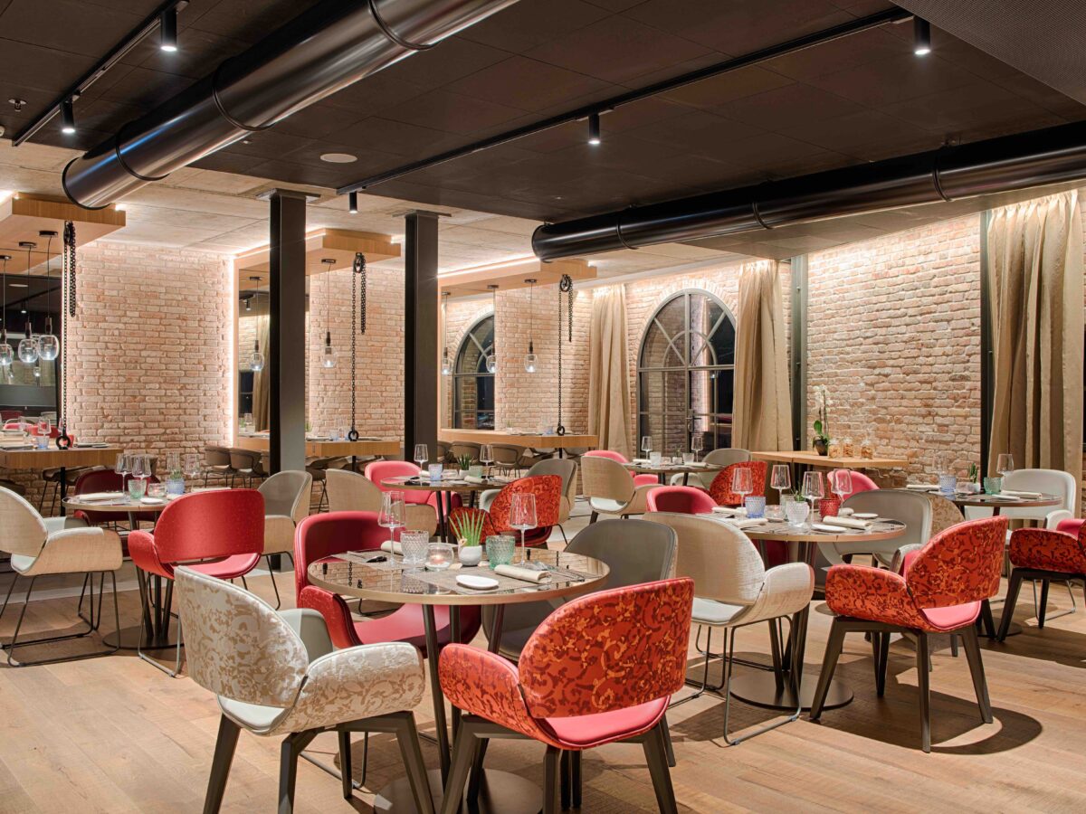 Attiguo all’hotel si trova il Parco Navagero, spazio pubblico connesso al complesso alberghiero e gestito a cura dell’hotel, da cui si può accedere direttamente dalla corte centrale, che offre un ampio spazio verde e di gioco per i bambini e che nelle ore serali è riservato esclusivamente all’hotel. E a proposito di esclusività, va ricordata la collaborazione dei tanti brand premium che hanno concorso con prodotti custom made alla realizzazione del progetto. I nomi sono di tutto rilievo, a cominciare da Artemide che ha creato una linea di lampade ad hoc di vetro-metallo partendo dallo studio della torcia utilizzata tradizionalmente nelle fornaci, per arrivare a Rubelli, che per il rivestimento delle poltrone del ristorante e dei tendaggi ha realizzato i tipici tessuti veneziani ispirandosi ai colori della laguna. Né vanno dimenticate le rubinetterie Zucchetti delle camere, le sedie e i tavoli firmati Saba Italia e Calligaris, l’arredamento outdoor di Varaschin, le attrezzature fitness di Technogym.