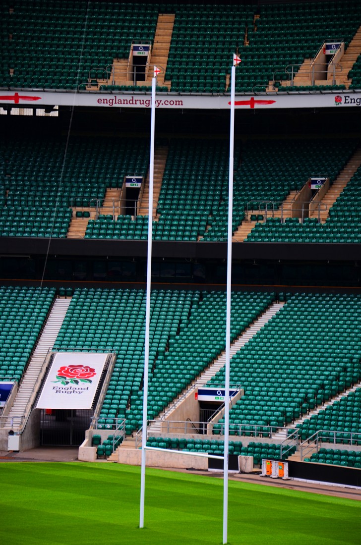 Calciare la palla ovale tra questi pali dello Stadio di Twikencham significa mandare in visibilio gli ottantaduemila spettatori che siedono sulle poltrone tutte verdi dell’Olimpo del rugby londinese