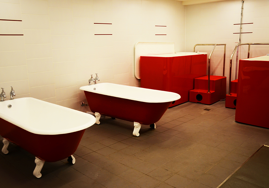 I giocatori di rugby dopo la partita si lavano in queste vecchie vasche in ghisa dipinte di vernice rossa