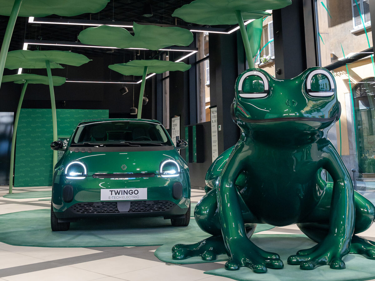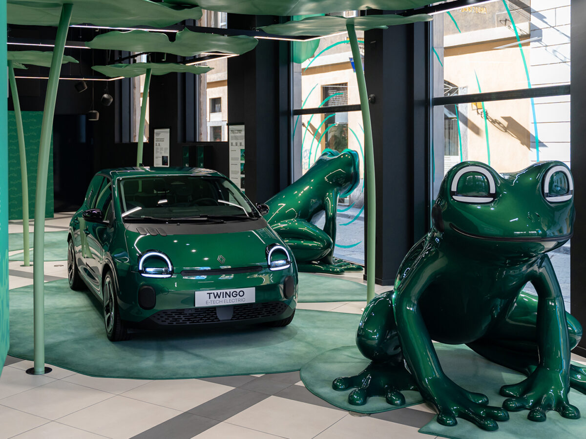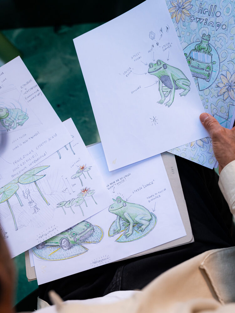 All’interno, ninfee giganti e foglie fuori scala trasformano lo spazio in uno “stagno” attraversabile, mentre 2 grandi sculture a forma di rana – realizzate da Marcantonio e rifinite nello stesso colore della vettura e con richiami diretti al suo frontale (occhi, guance e sorriso) – amplificano il legame tra oggetto e ispirazione.